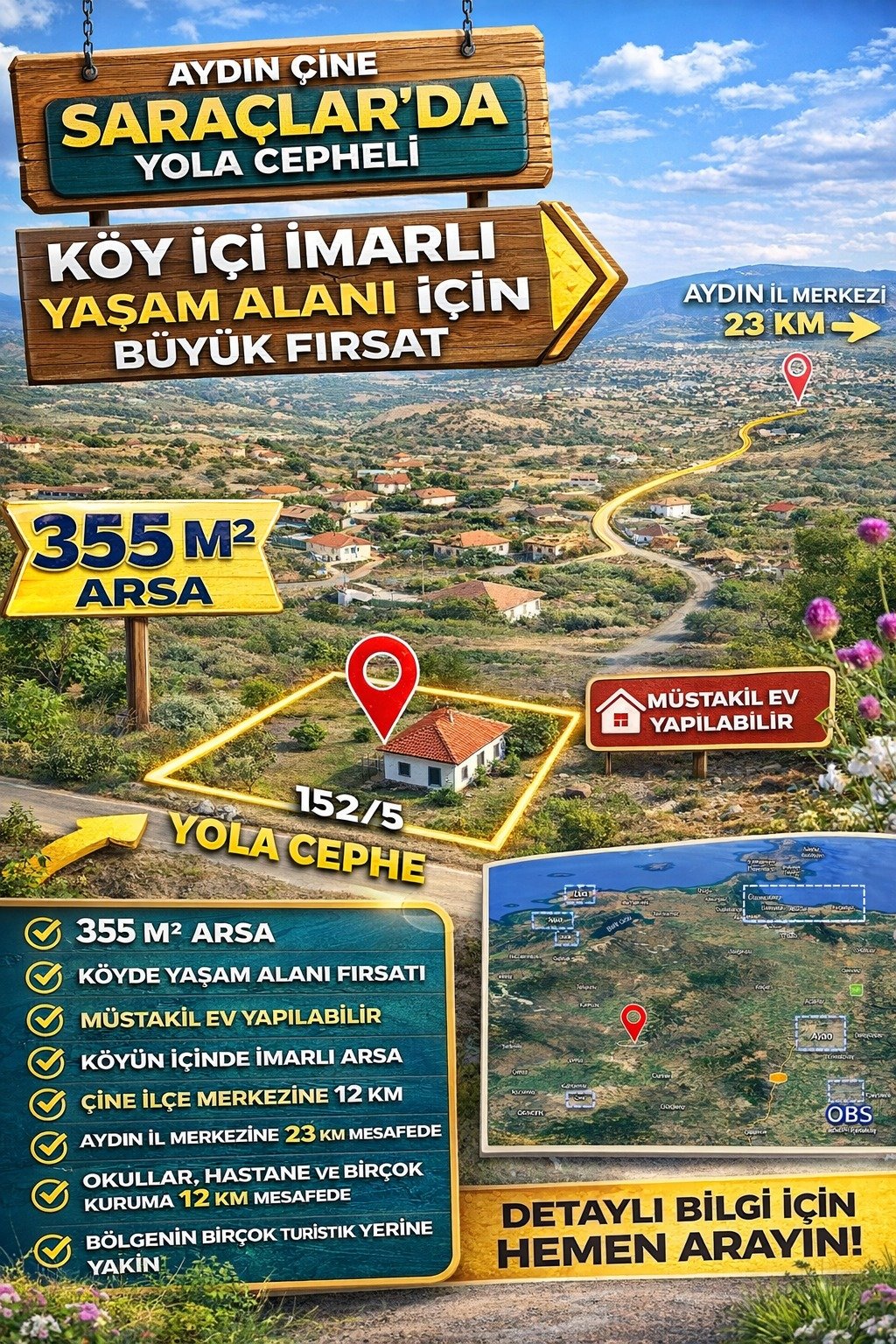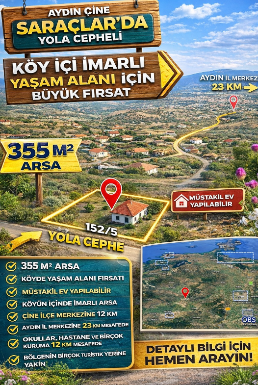 🏡 Aydın Çine Saraçlar’da Satılık İmarlı Arsa | 355 m² | Yola Cepheli | Köy İçi Yaşam Fırsatı